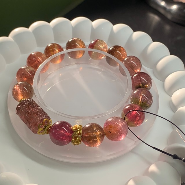 内径調整別途費用。カテゴリー➡︎内径調整 1cm以上のサイズアップの場合ご連絡いただけると助かります。 特注オーダー(穴のサイズを大きくしてもらってるので通常より頑丈)のピンク淡水パールに ルベライトカラーのトルマリン、カボチャを入れた デザインブレスです☺︎ 10.5mm前後 top14mm 内径15.5cm 天然淡水パールなので傷凹み少ない方ではありますが、多少はございます。 神経質な方はご遠慮ください。