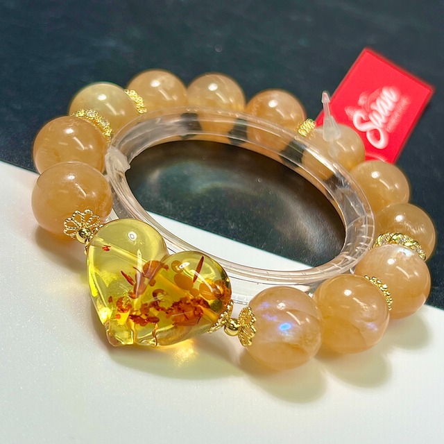 内径調整別途費用。カテゴリー➡︎内径調整 1cm以上のサイズアップの場合ご連絡いただけると助かります。 大ヒット商品の花アンバーの桃尻ハートを使用したデザインブレスレット✨ デザインで使われてる花アンバーは全て高品質、透明度が高く花がくっきり見えるのが特徴的になっています。 ブレス部分はプラジオクレースムーンストーン オレンジベースからブルーのシラーが見えます☺️ 暖かいオレンジブレスが秋にピッタリです✨ 13.3mm ハート 縦19.5×横26×厚み12.3mm 内径16cm