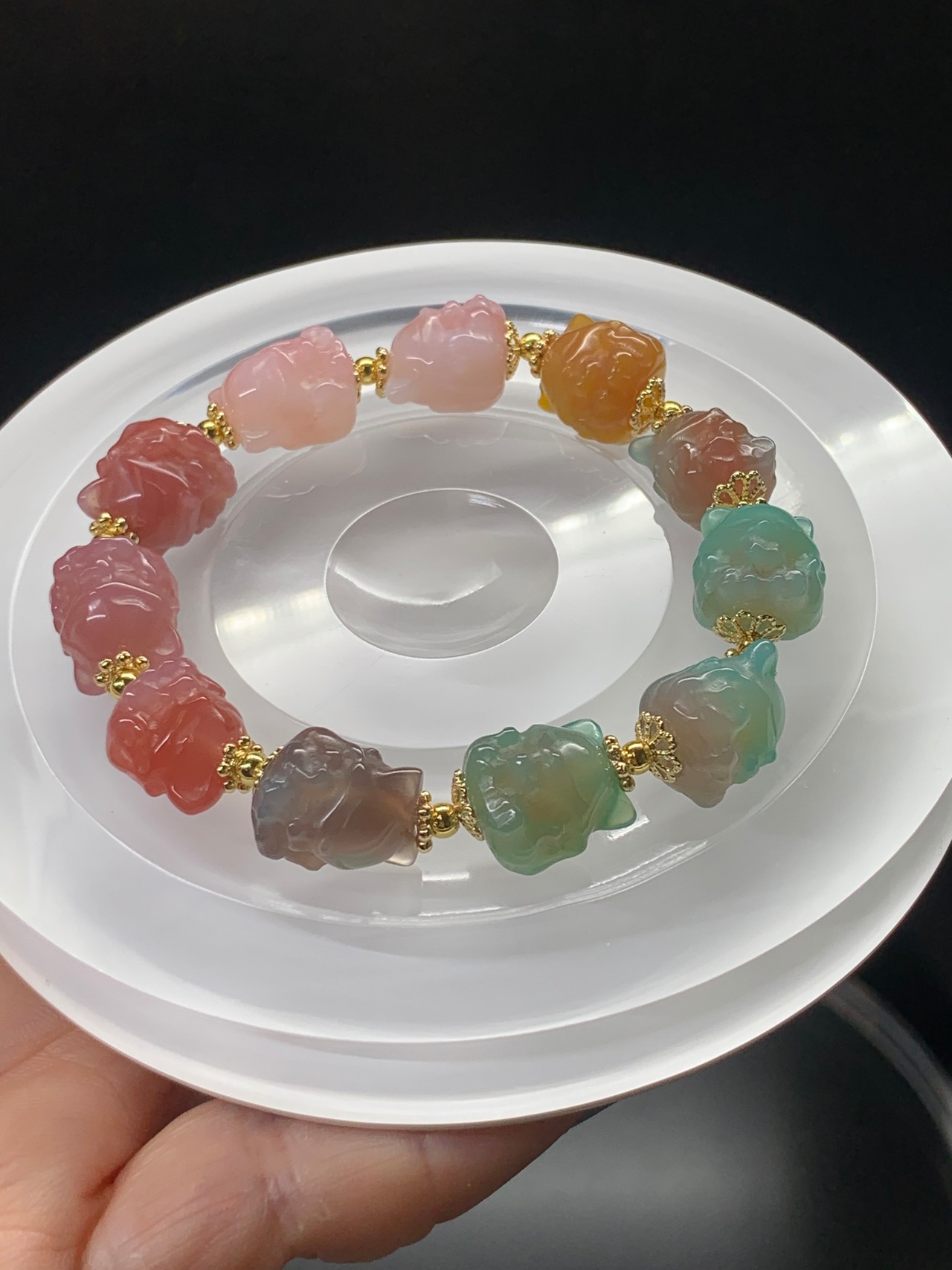 九尾狐さんメノウ 横11.5ミリ 長さ14ミリアップ 中のグリーンと黄色は染めです ピンクは天然 内径16センチ