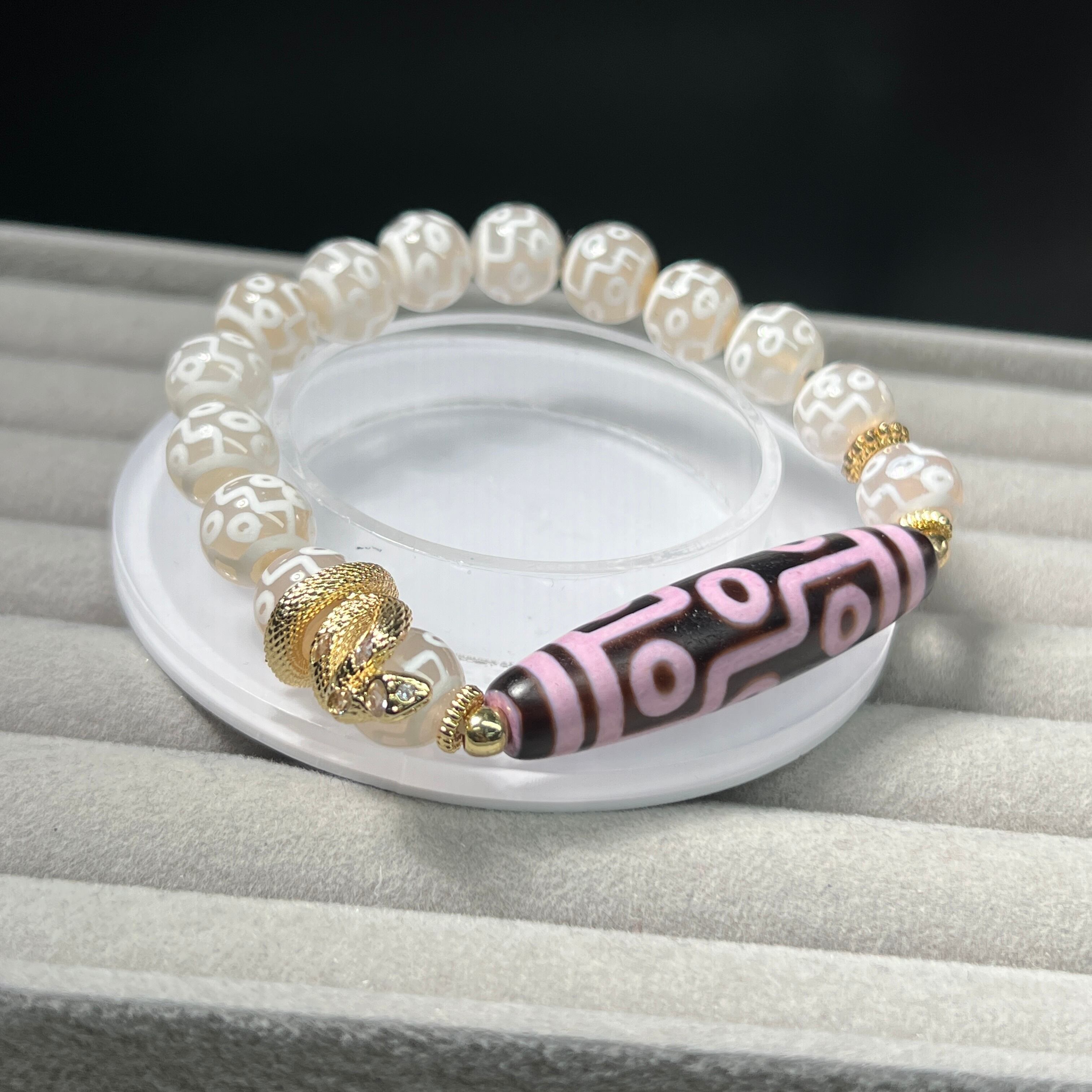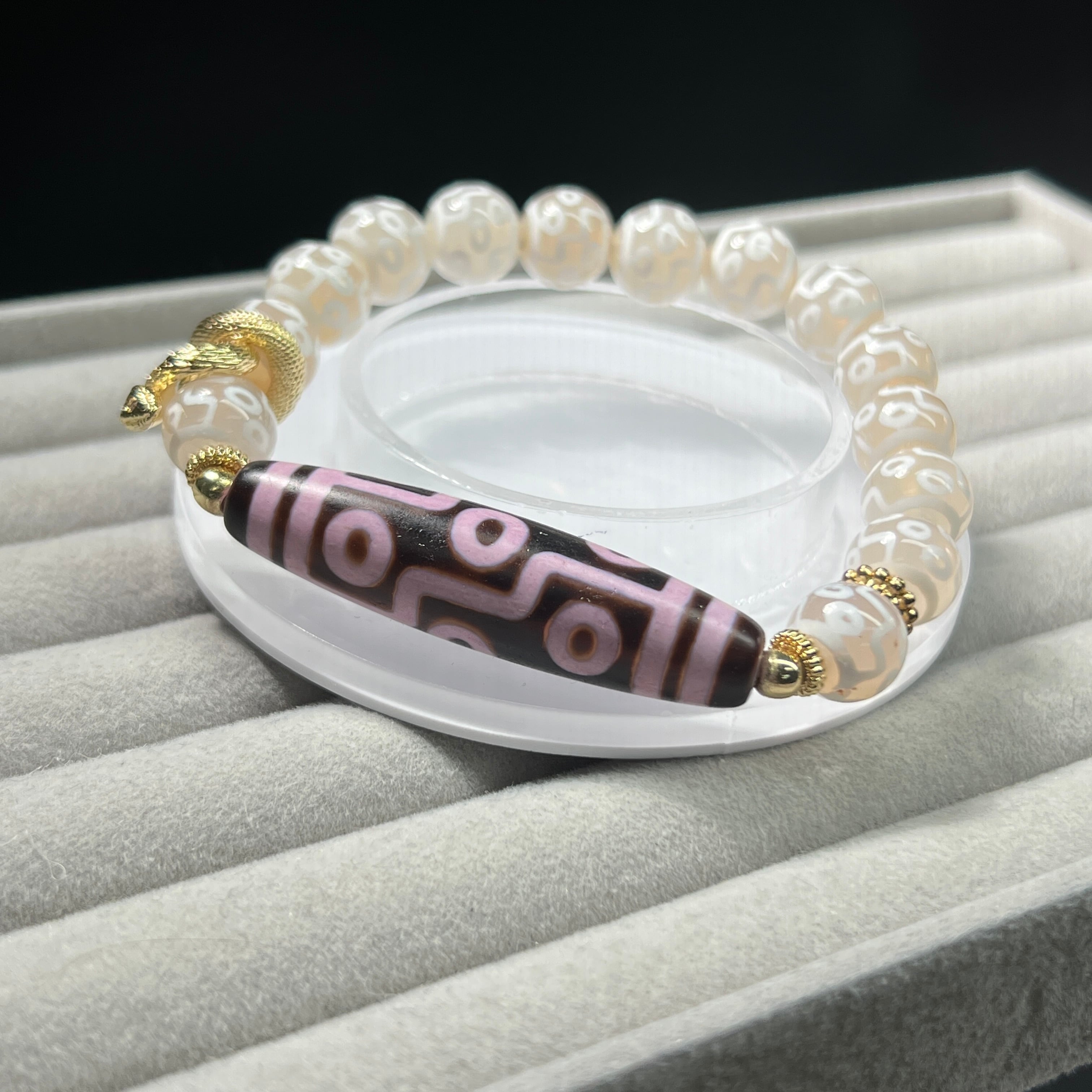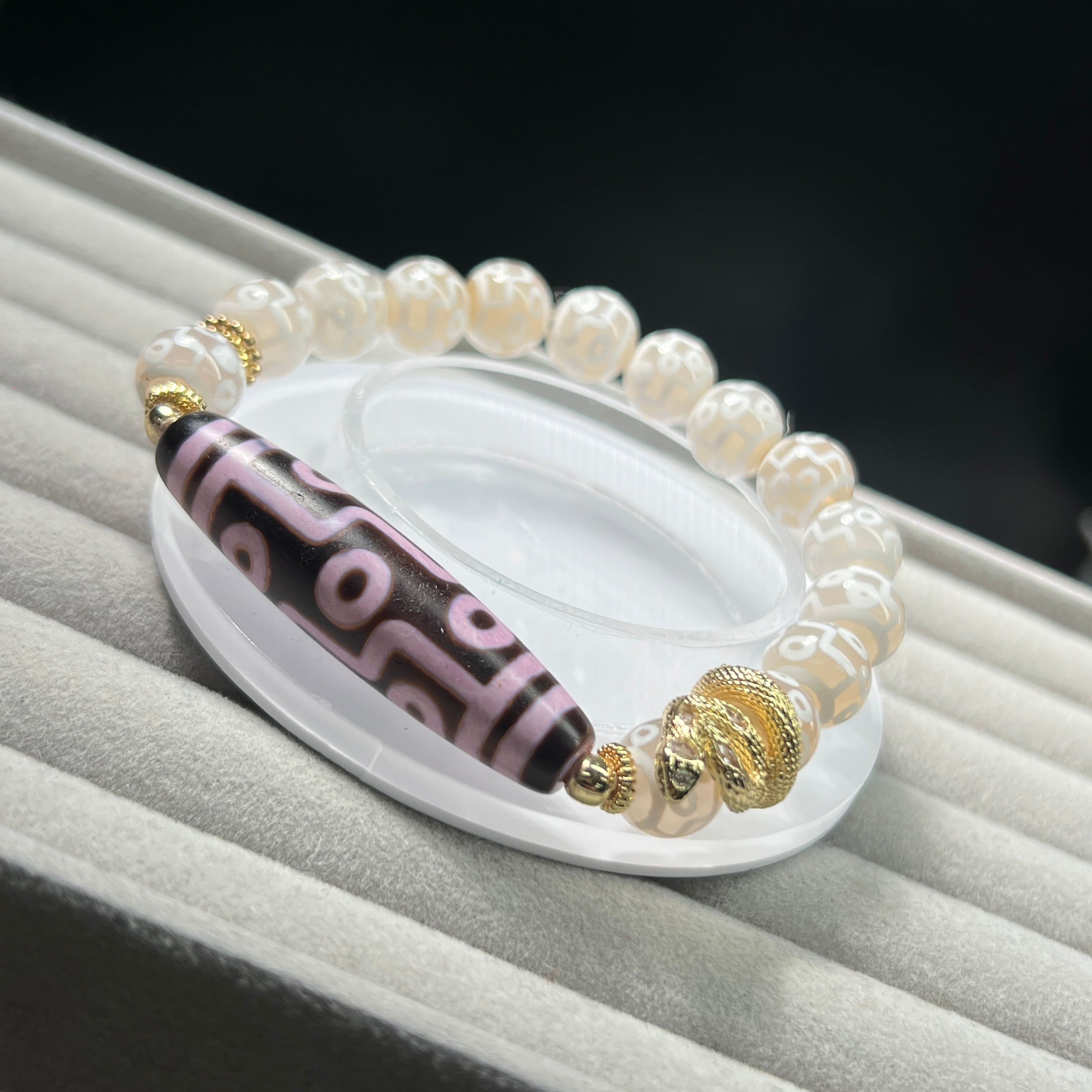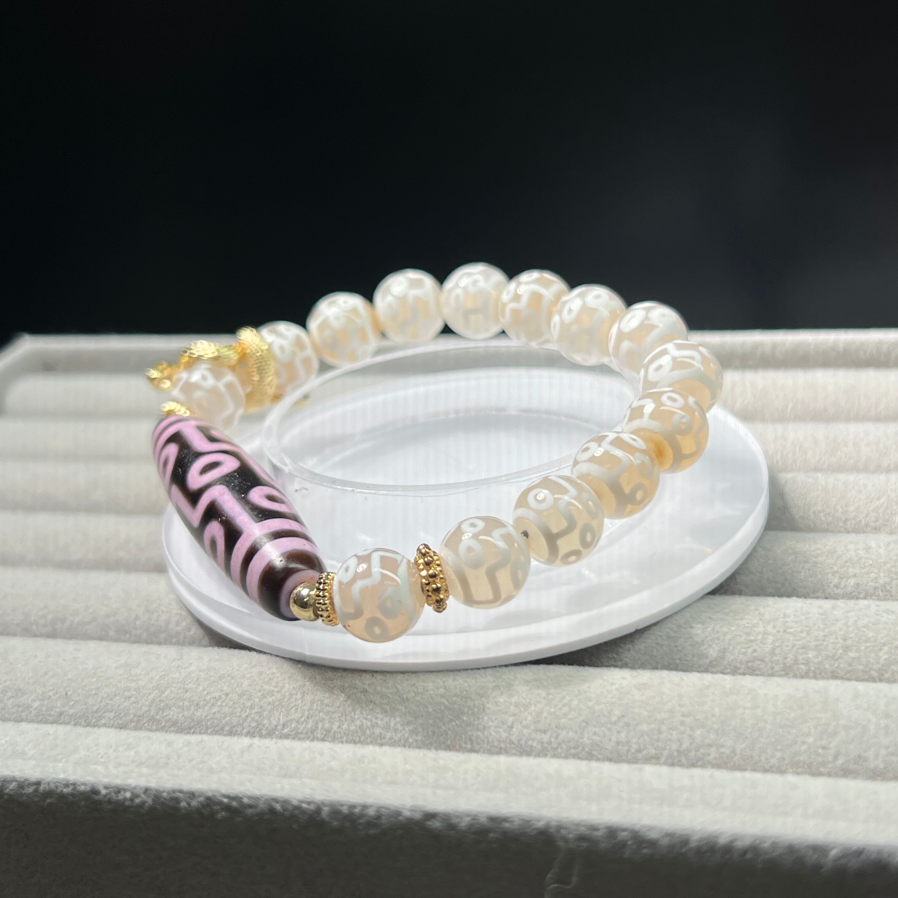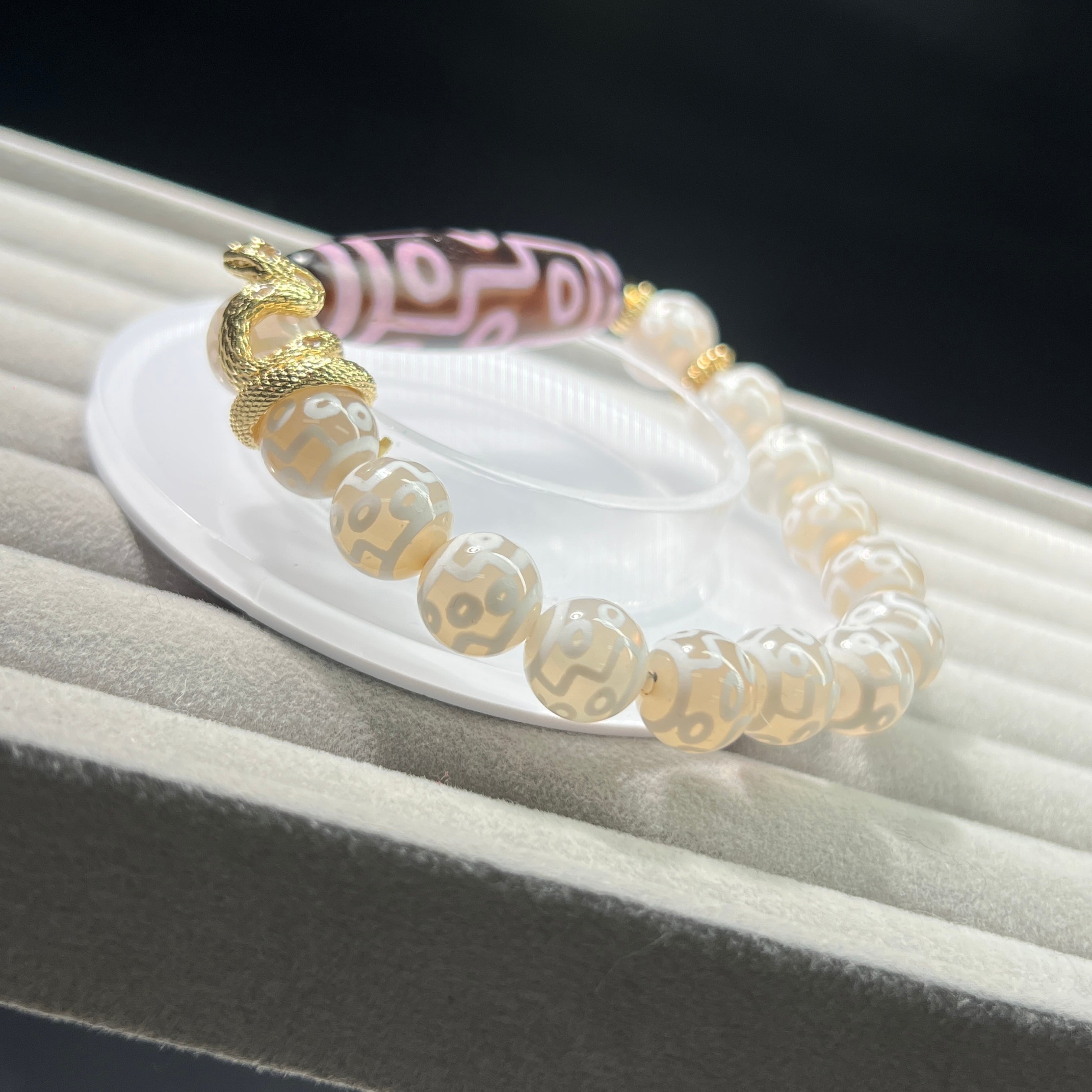 九眼天珠(くがんてんじゅ)は、天珠の中でも最高位の強力なパワーを持つとされるお守りで、チベット仏教の九乗(九つの功徳)を表し、事業成功、願望成就、権力・名声、財運、悪霊退散、立身出世など、あらゆる面での総合的な幸福と成功をもたらすと信じられています。