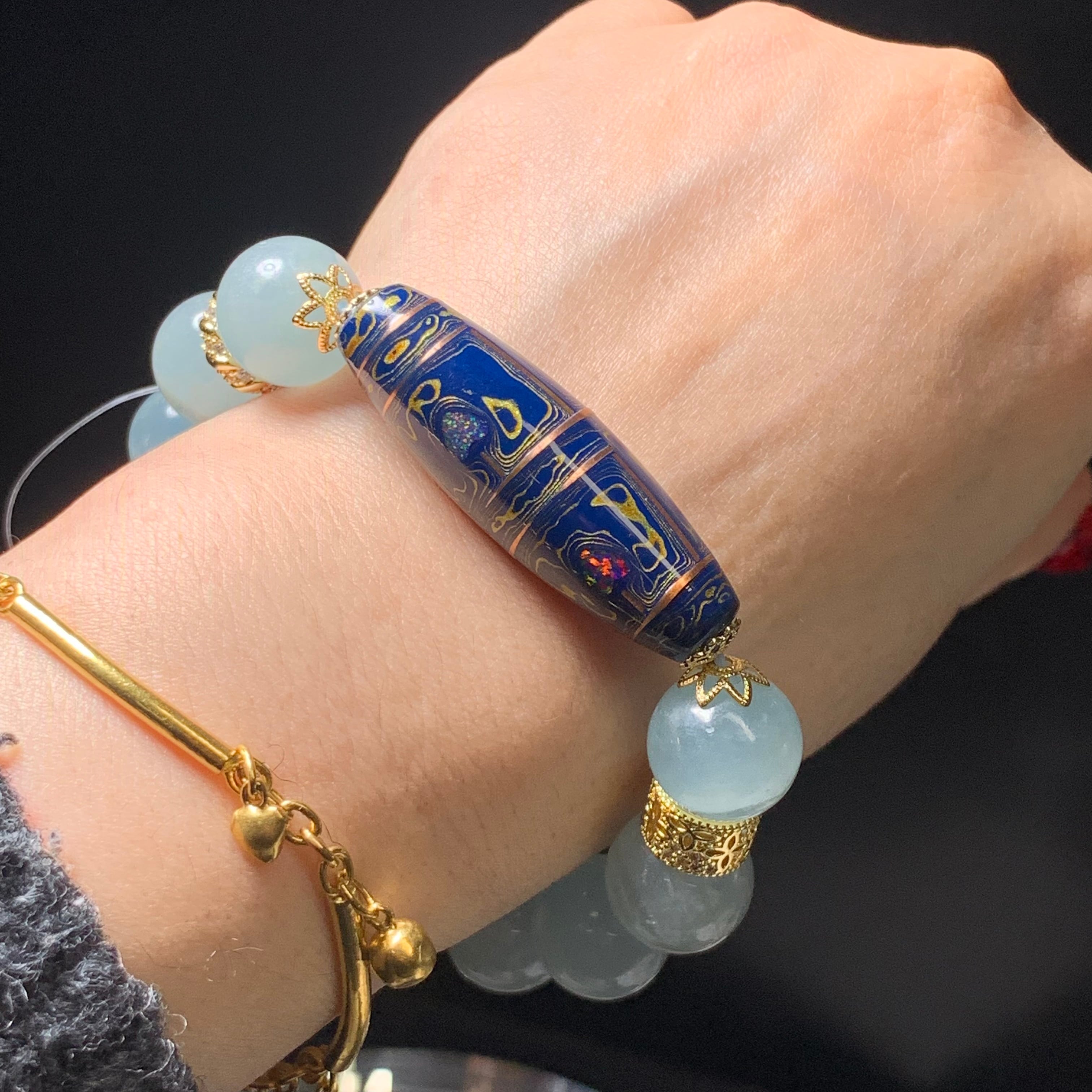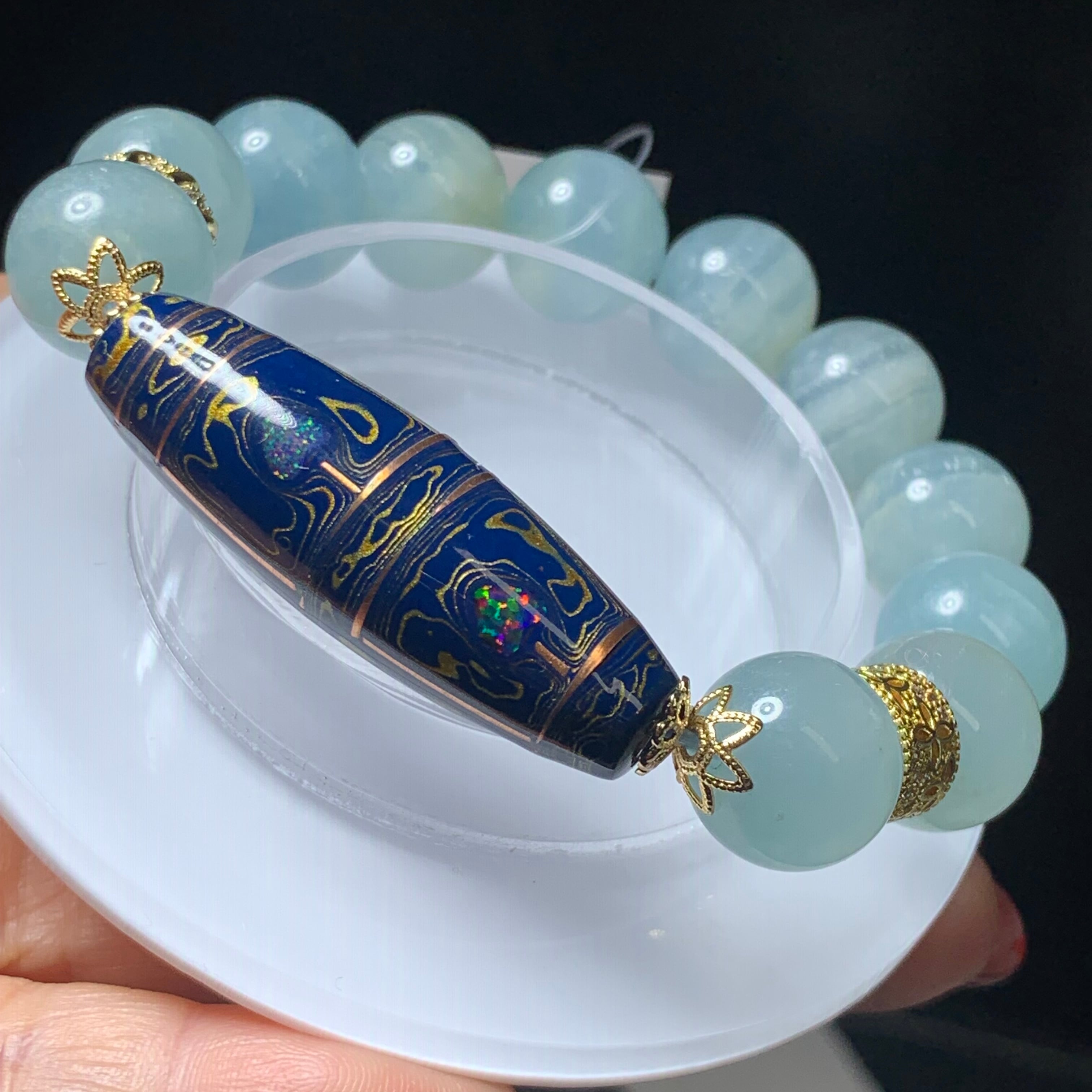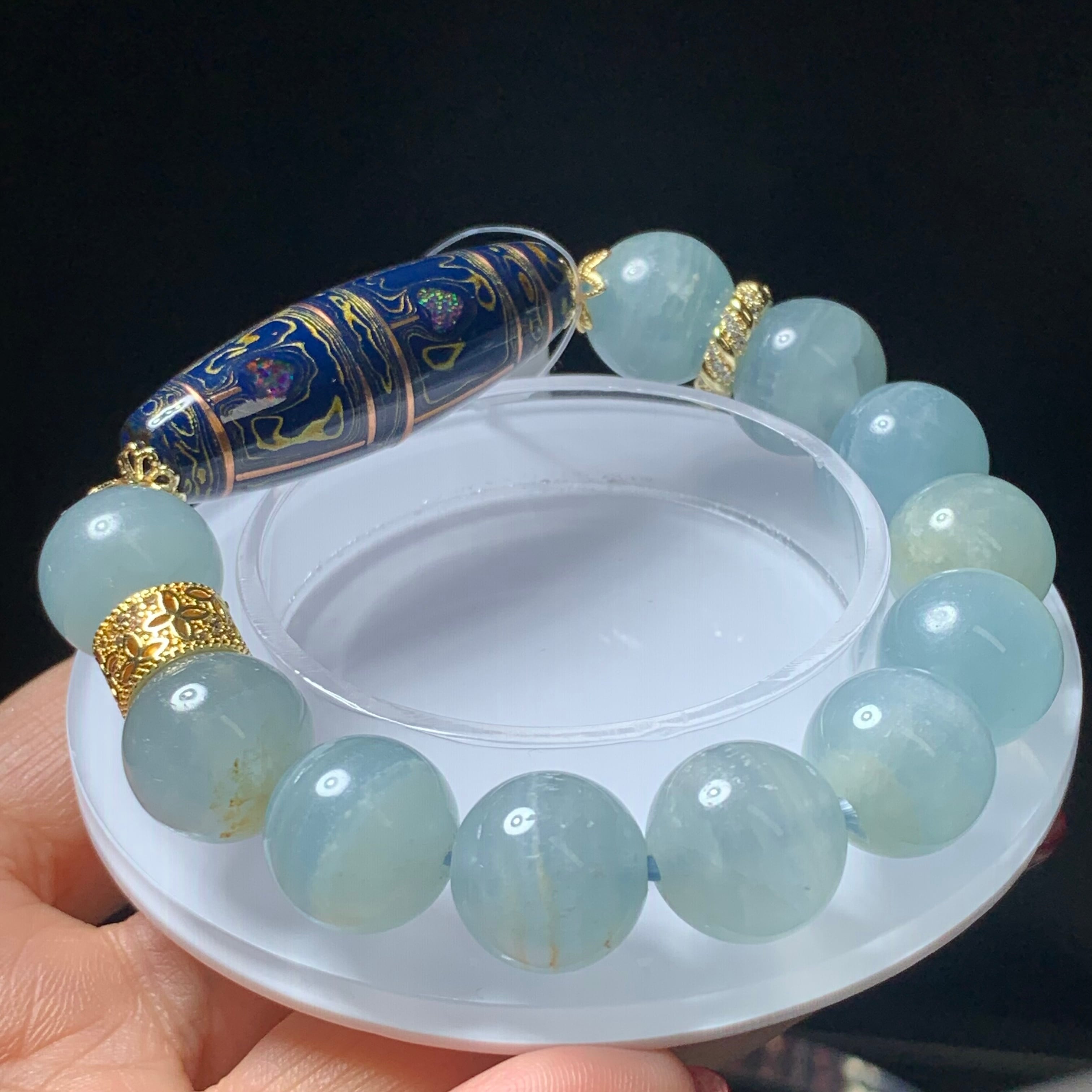 シマシマアクアマリン13ミリ 内径15.5センチ 天珠四葉菩提 幸運を呼ぶ、安定、向上、願いが叶う