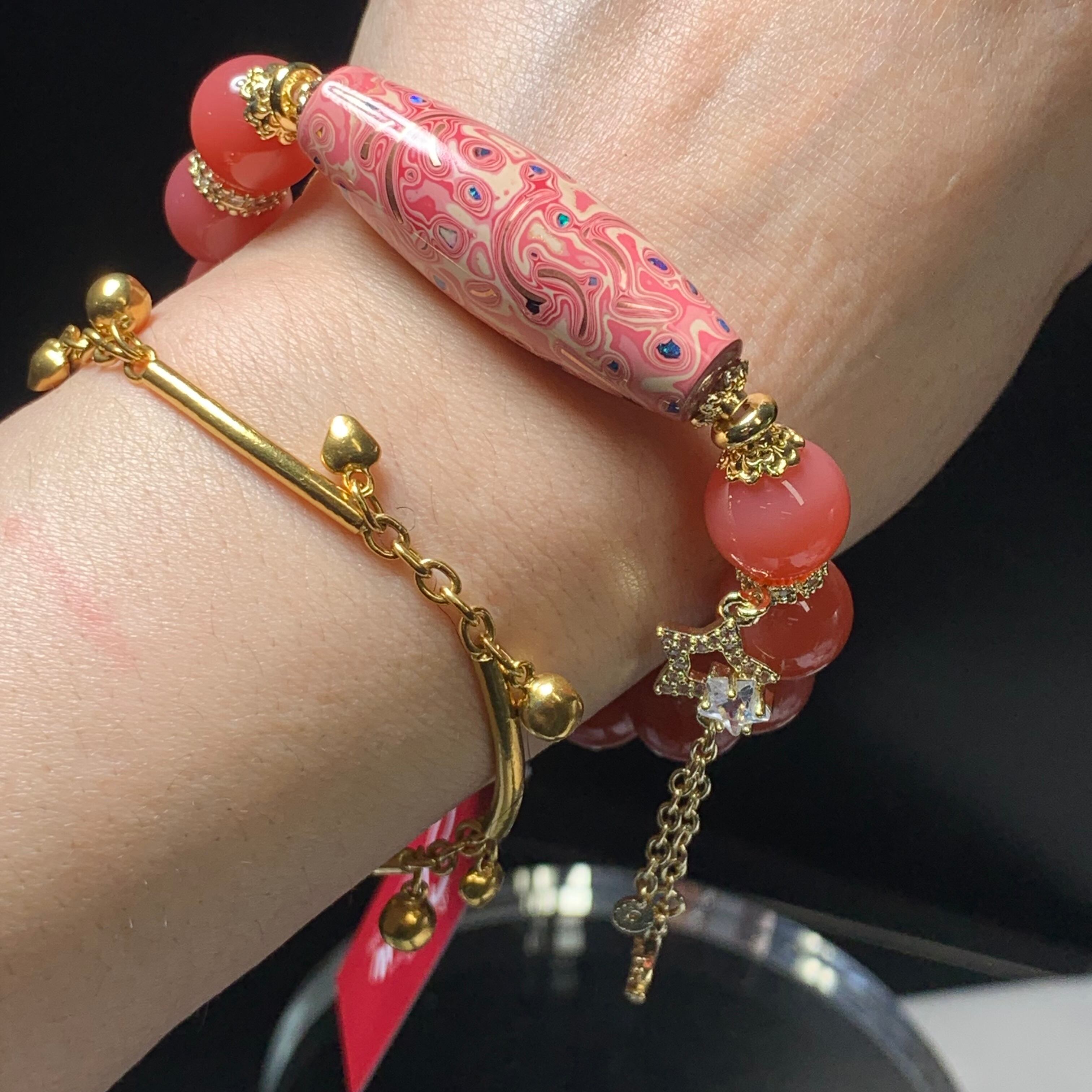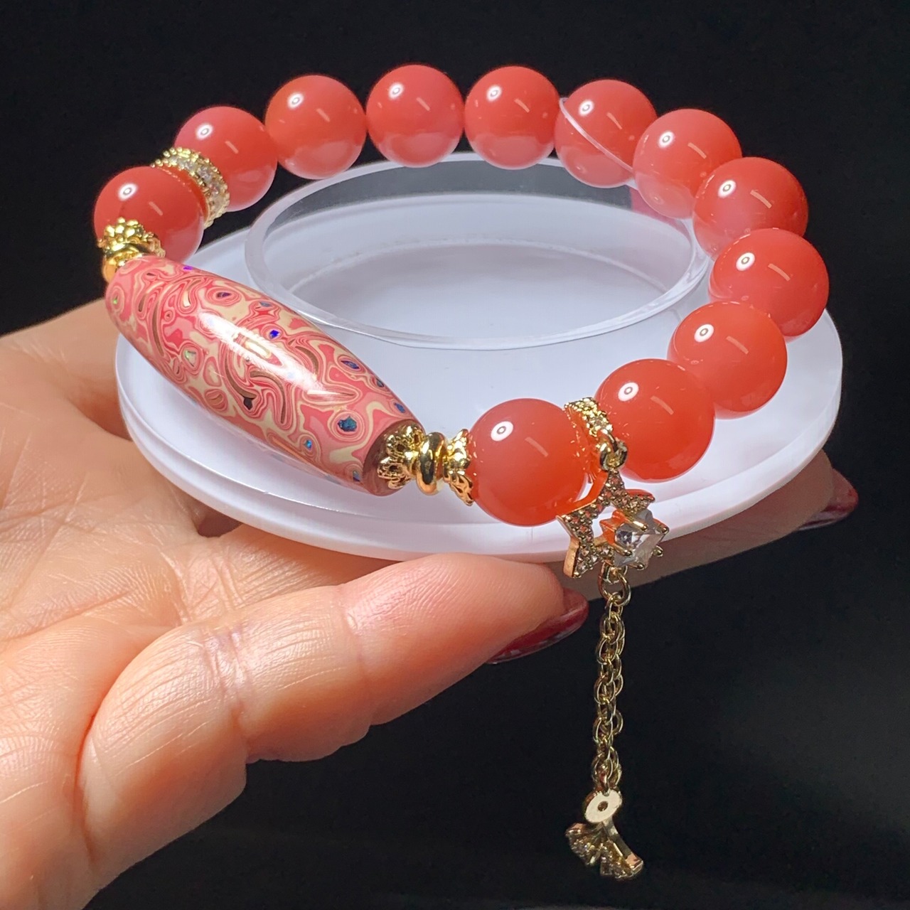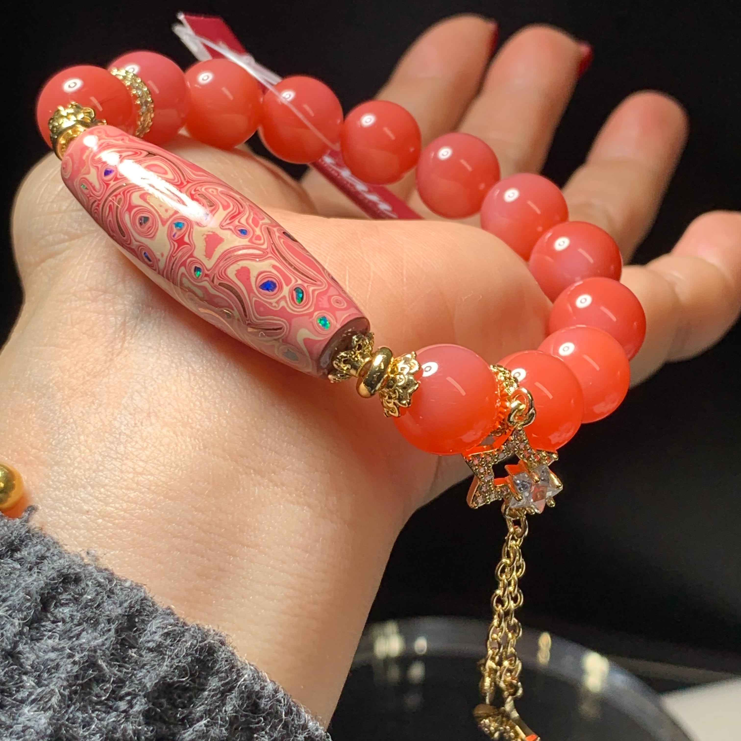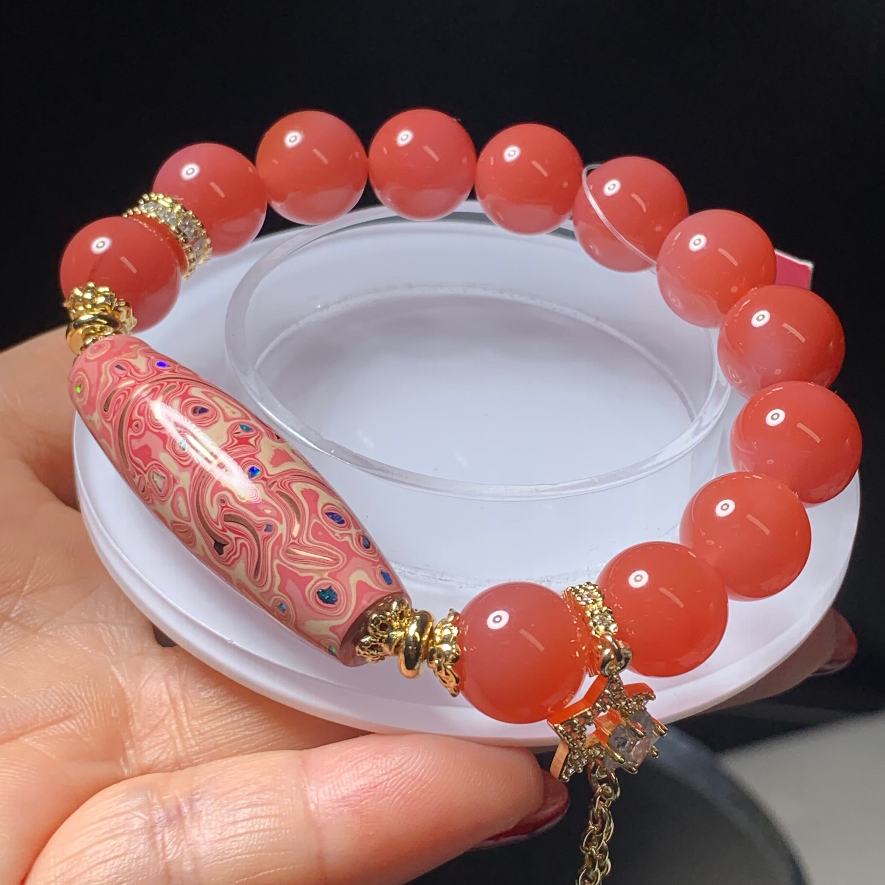 ピンク如意天珠 高品質瑪瑙 サイズ11.8ミリ 内径16センチ
